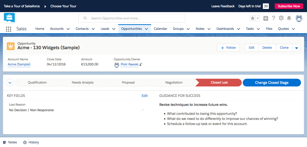 Salesforce wspiera dość popularny wśród systemów CRM model sprzedaży oparty na tzw. leadach oraz szansach sprzedaży. Standardowo system skonfigurowany jest pod kątem realizacji sprzedaży typu B2B, jednak z powodzeniem sprawdzi się on również jako narzędzie w sektorze B2C. Wszystkie szanse sprzedażowe prezentowane są na osi przedstawiającej kolejne etapy procesu sprzedaży wraz z ich celami oraz zadaniami do wykonania przez handlowca. System umożliwia ponadto definiowanie targetów sprzedażowych dla zespołu i późniejsze monitorowanie jego realizacji. |